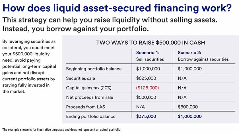 Liquid asset secured financing is a flexible line of credit secured by eligible assets in one or more of your investment accounts.