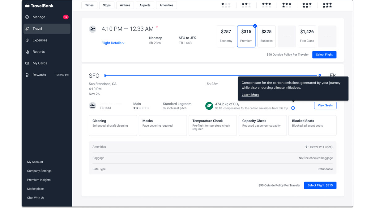 TravelBank works to continually add more value for users. Thanks to a new partnership with sustainability specialist SQUAKE, users can now easily compare flights using advanced CO2 performance metrics, such as aircraft type, routing and more. In the near future, users will also have the option to choose hotels based on sustainability ratings and select environmentally friendly ground transportation, considering factors like fuel type, engine efficiency and car type.
