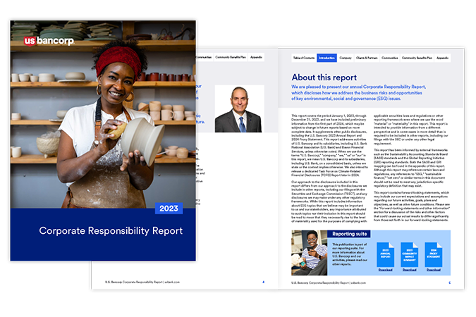 At U.S. Bank, we care deeply about meeting our stakeholders’ needs, promoting sustainable business practices and supporting economic growth. We are committed to transparency in our sustainability activities.