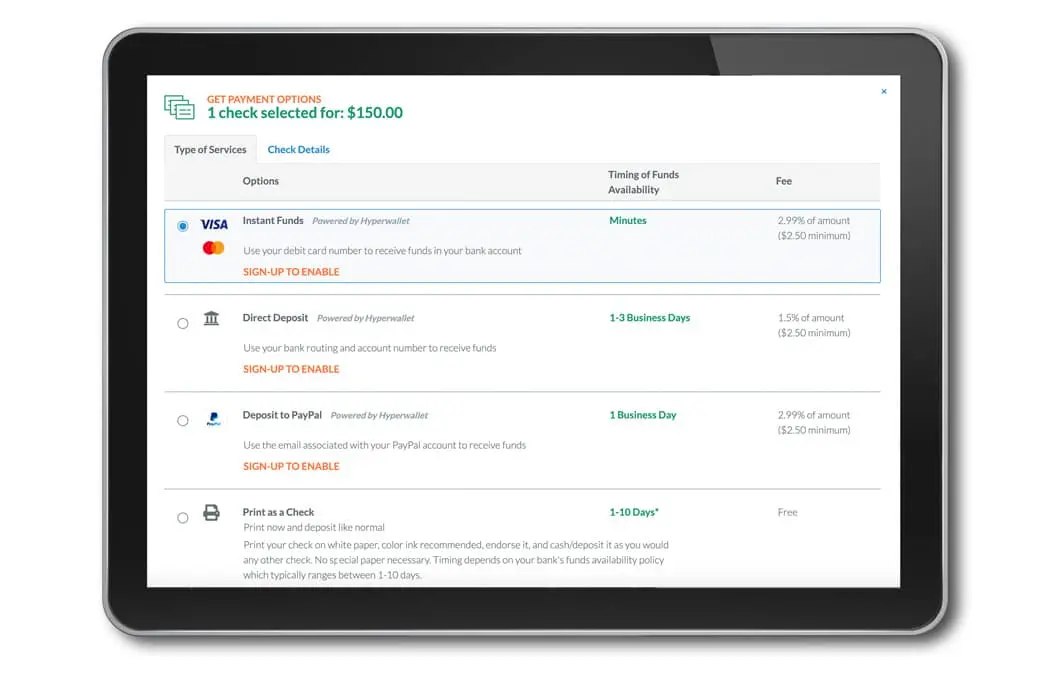 When available, recipients can choose eDeposit Services within DPX and have their funds available in minutes. The recipient can deposit directly to a bank account, a debit card or a PayPal account. Recipients pay a small fee that is conveniently deducted from the eCheck amount.