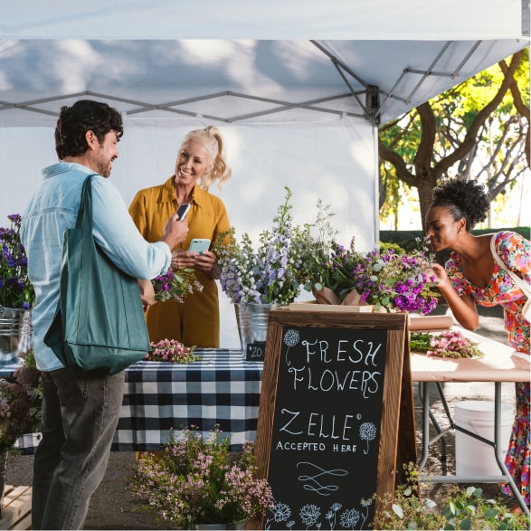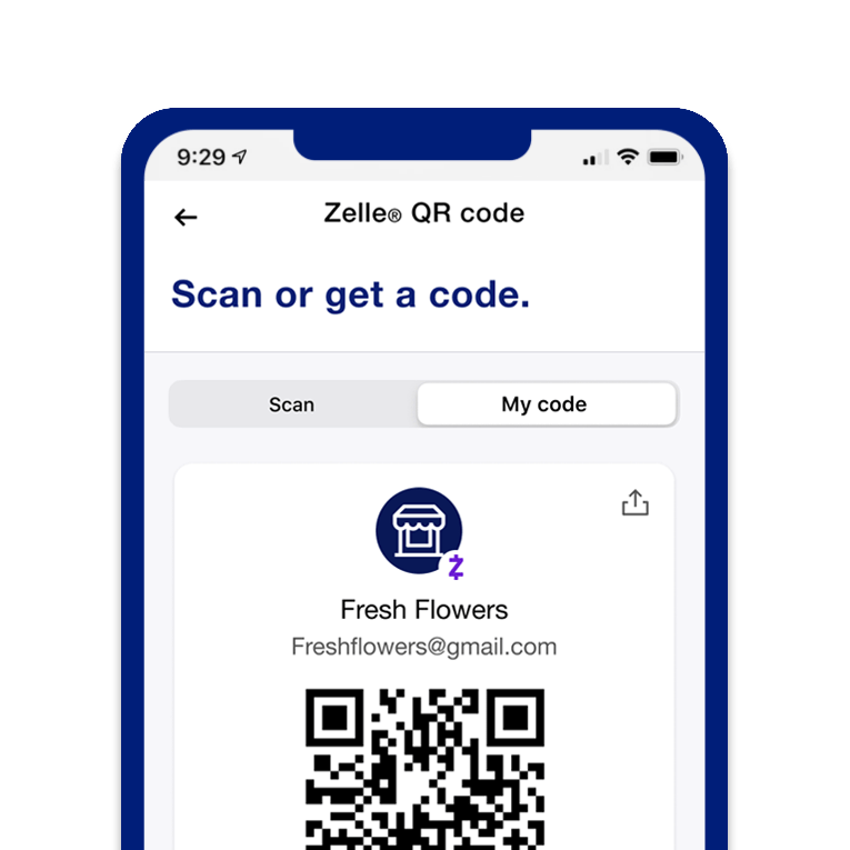 To receive money using Zelle® with a small business account, share your enrolled email address or United States mobile number with your customers and ask them to send you payment with Zelle® right from their banking app. No need to share any sensitive account details. After the customer sends their payment to you with Zelle®, you will receive your money directly into your enrolled bank account. Or if you’re using the mobile app, you may provide them with your code. (See information about codes below.)