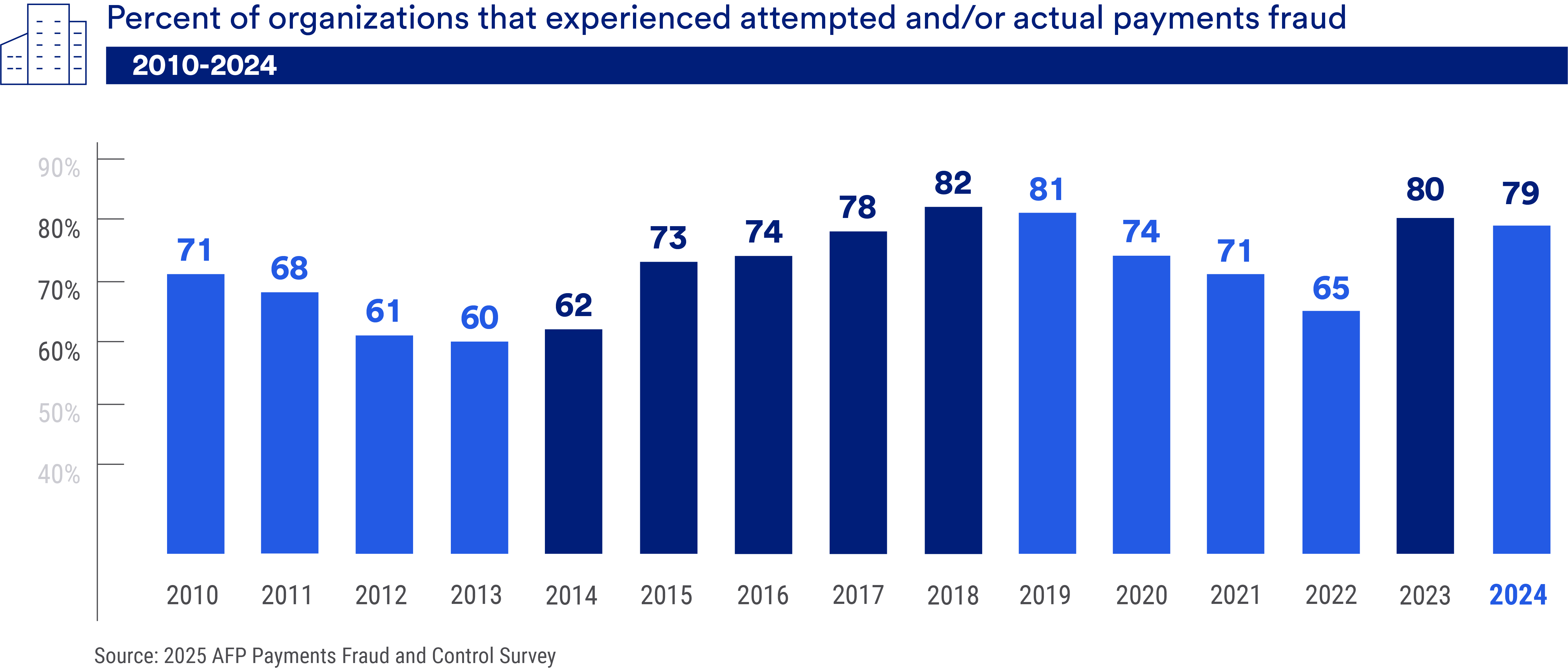 In the 2025 AFP Payments Fraud and Control Survey, the number of organizations experiencing payments fraud remained elevated at nearly 8 out of 10.