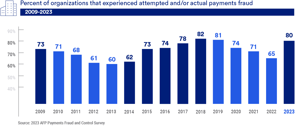 After payments fraud numbers were down for three straight years, incidents spiked in 2023, with 80% of organizations reporting that they were victims of payments fraud, up from 65% in 2022. In 2024, the portion of companies being attacked remained stubbornly high, dropping only one percentage point, suggesting that increased diligence and preventative measures are essential if treasury and finance professionals want to stay ahead of fraudsters to mitigate business interruptions and financial losses.