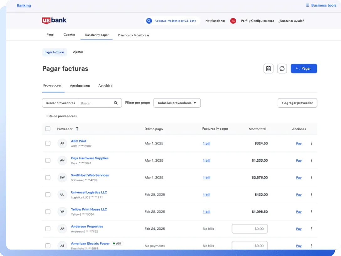 Toma el control de tus finanzas directamente desde la banca en línea empresarial o la aplicación móvil. Programa y realiza pagos fácilmente utilizando tu tarjeta de crédito o tu cuenta de cheques, todo con la confianza de que tus detalles bancarios permanecen seguros y privados.