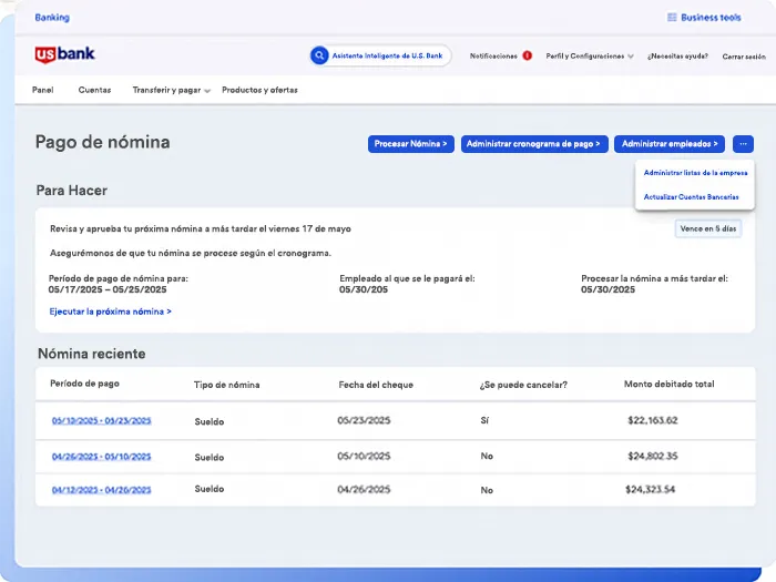El servicio de Nómina de U.S. Bank provisto por Gusto centraliza las herramientas que necesitas para administrar la nómina, realizar declaraciones fiscales automatizadas y simplificar las actividades cotidianas de la empresa.2
