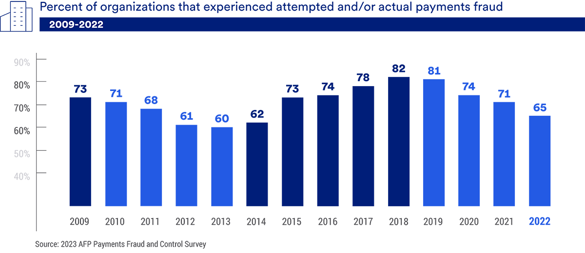 After payments fraud numbers were down for three straight years, incidents spiked in 2023, with 80% of organizations reporting that they were victims of payments fraud, up from 65% in 2022. In 2024, the portion of companies being attacked remained stubbornly high, dropping only one percentage point, suggesting that increased diligence and preventative measures are essential if treasury and finance professionals want to stay ahead of fraudsters to mitigate business interruptions and financial losses.