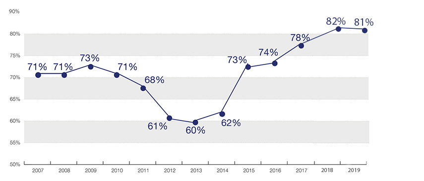 After a steady decline from 2018 to 2022, the number of organizations that experienced attempted or actual payments fraud rose to 80% in 2023, just shy of the survey’s previous high mark of 82% in 2018. The number of organizations attacked in 2024 remained elevated at 79%.