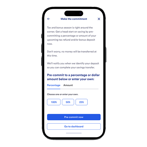 Research shows pre-committing can help some people save an average of 25% more.1 Our digital tool makes it easy to pre-commit to save your refund or bonus. Just select how much you want to save, and we'll remind you when your deposit arrives.