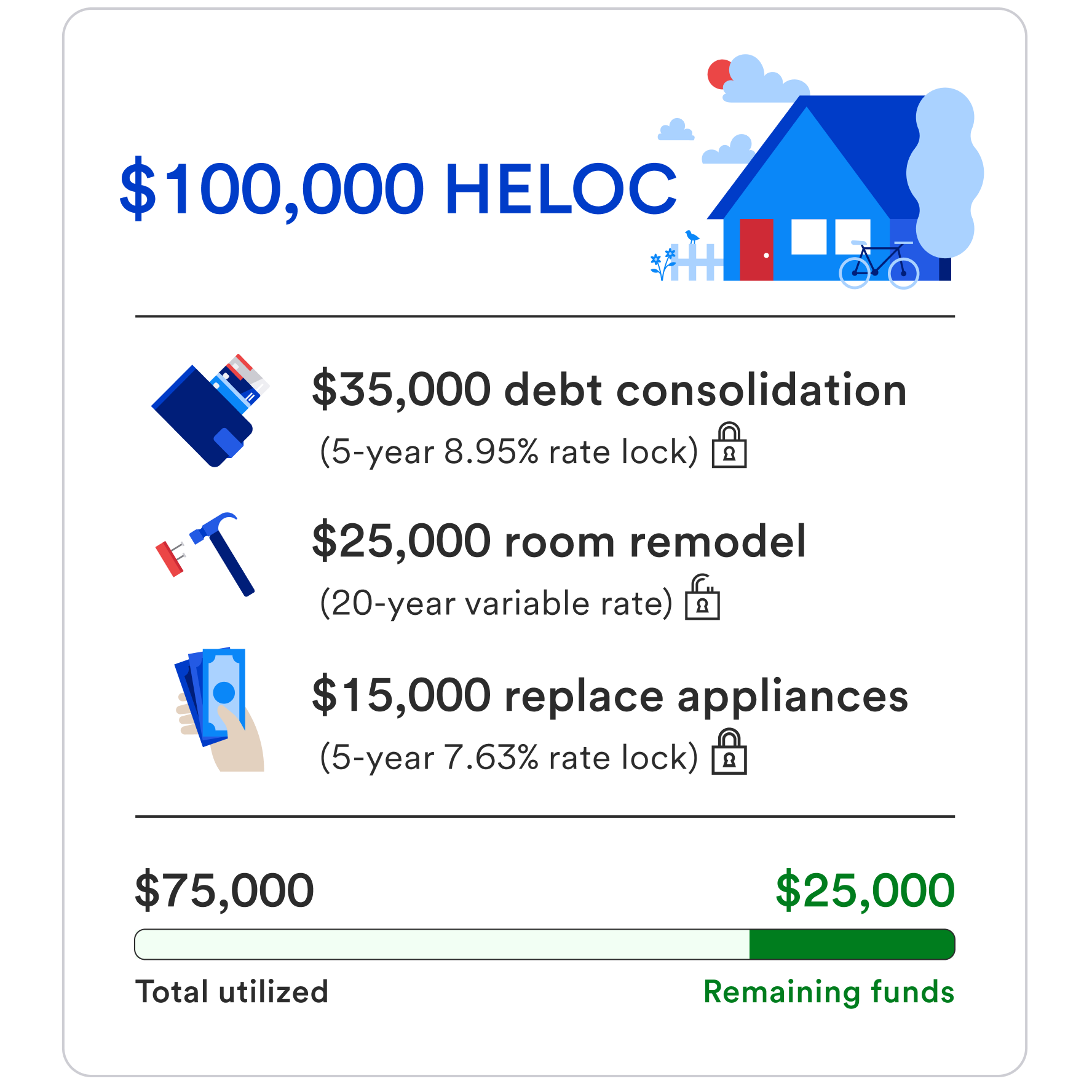 Once you close on a HELOC, you have the option to lock in a fixed interest rate for up to 20 years on some or all of the money you borrow. That way, if interest rates rise in the future, your fixed-rate option(s) won’t.