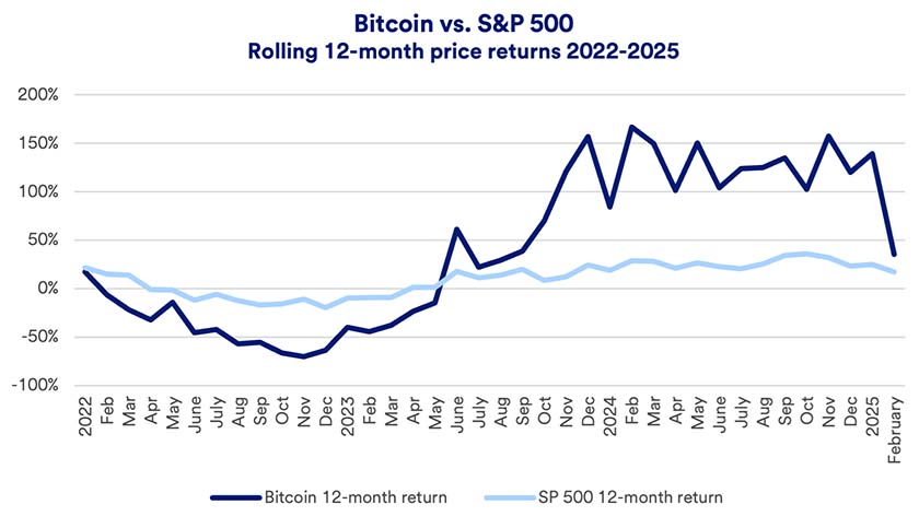 Bitcoin is by far the most popular cryptocurrency. Other notable cryptocurrencies include Ether, Dogecoin and BinanceCoin. Based on their limited trading history, Haworth notes the highly volatile nature of cryptocurrency values. “Part of this is they trade on a 24-hour-a-day, 7-day-a-week basis,” he says. “While there are some capital market regulatory features that can cap trading volatility for traditional assets like stocks, these don’t exist in the digital asset universe.” The price of the industry’s recognized benchmark asset, Bitcoin, has repeatedly experienced dramatic swings. Even in just the last few years, Bitcoin’s price volatility far exceeds the S&P 500’s. Investors who typically consider stocks the most volatile asset in their portfolio, must recognize that cryptocurrency volatility is typically far more pronounced. This is illustrated in the following chart showing 12-month rolling returns (price-based) in Bitcoin versus the S&P 500 Index.