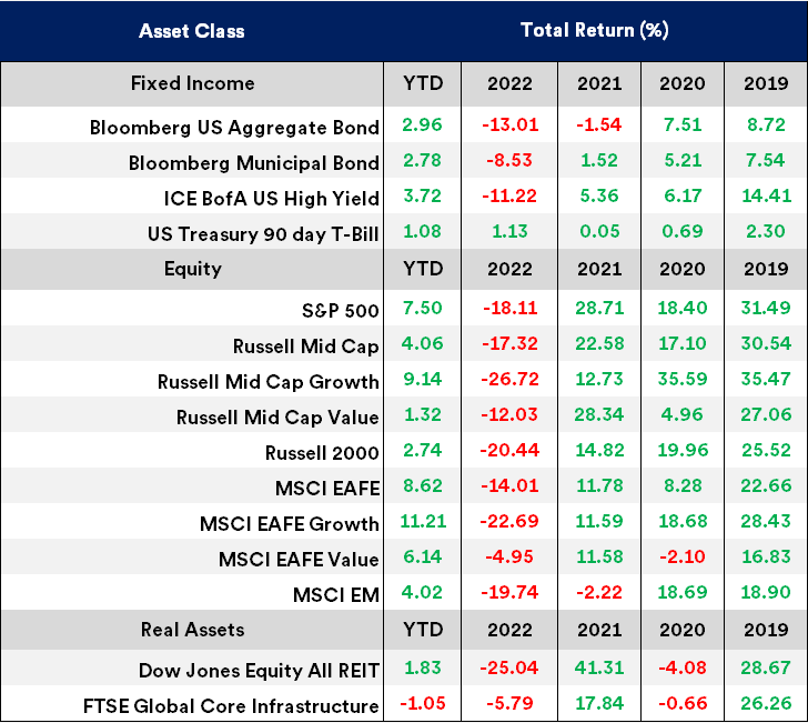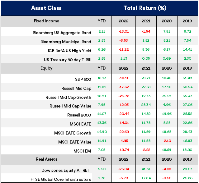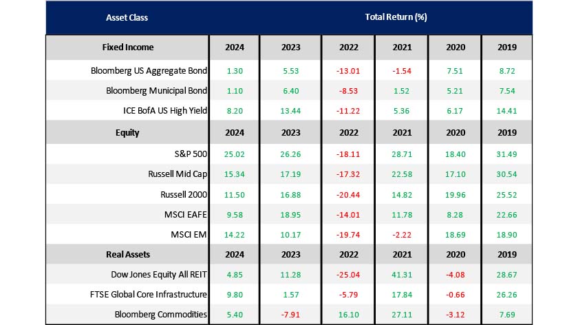 The table below details annual performance for the past six years across a variety of asset classes (represented by market indices).
