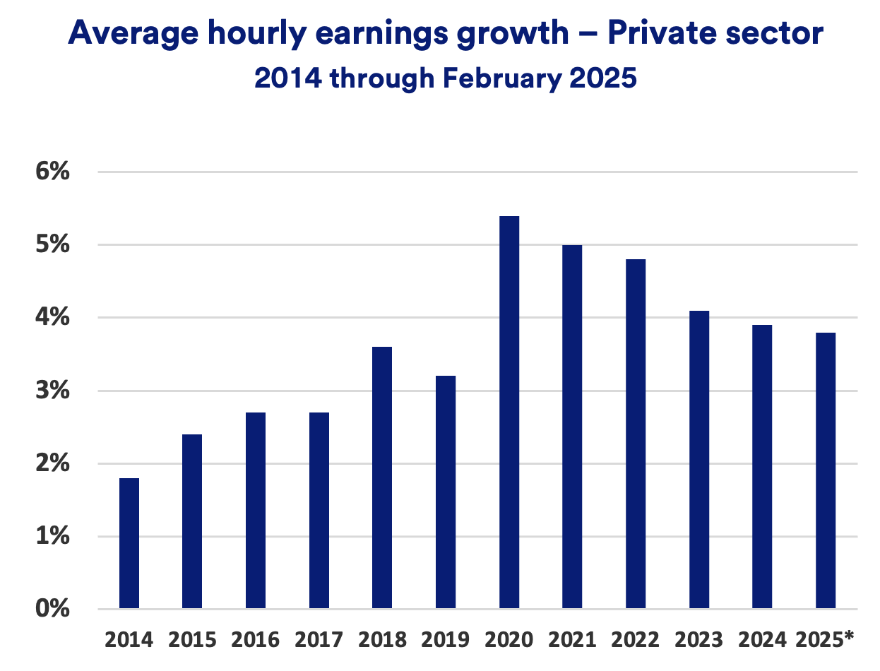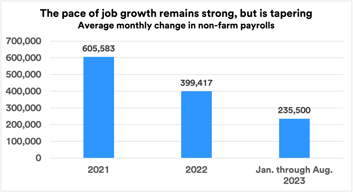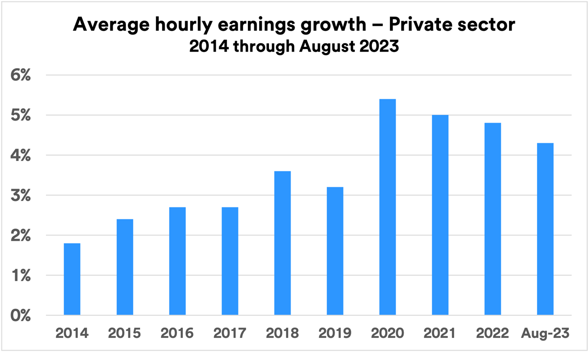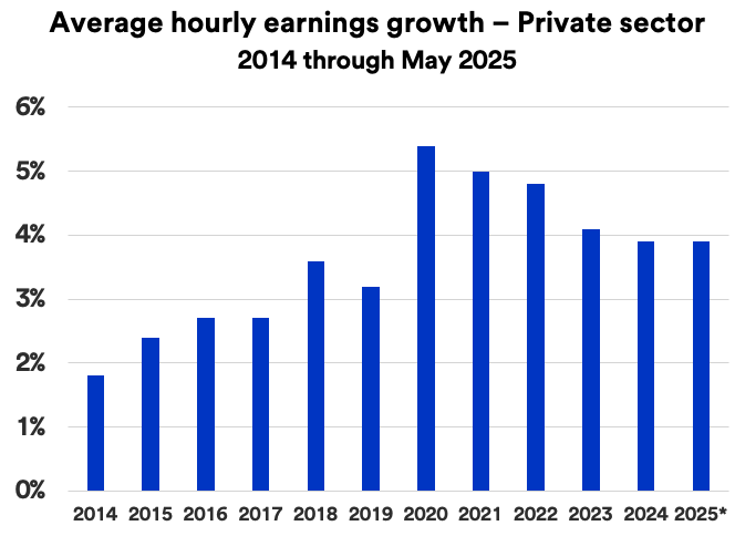 The labor force participation rate, another key metric, rose by 0.1% to 62.4% in September, still below the recent high of 62.8% in November 2023.4 “Shrinking labor force participation is a negative sign and aligns with an aging workforce,” says Haworth. “But less available labor has not translated to higher labor costs.” Average hourly earnings increased 3.8% year-over-year in September, slightly below last year’s pace.1