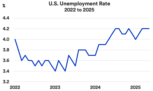 The unemployment rate remains low by historical standards. Twice a year, the BLS revises nonfarm employment estimates; recently, it reduced the 12-month period ending March 2025 by an average of 67,000 jobs per month, suggesting labor market weakness began in early 2024.2 While slowing job growth is just one indicator, solid corporate earnings, trade deals and likely Fed rate cuts contribute to our glass half-full outlook.