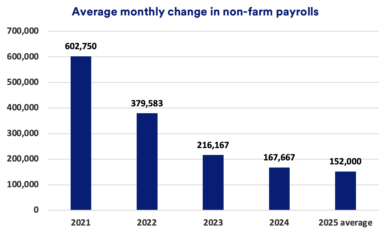 In September, the U.S. economy added 119,000 jobs, surpassing economists’ expectations. The U.S. Bureau of Labor Statistics (BLS) released this report nearly seven weeks late because of the government shutdown. The unemployment rate climbed to 4.4% in September, up from 4.3% in August. Although consumer spending remains strong, recent downward job growth revisions reveal a softening labor market. During the third quarter, payrolls grew by an average of 62,000 jobs per month, a sharp drop from last year’s third-quarter average of 133,000 new jobs monthly.1 The BLS plans to release its next report on December 16, which will include November payrolls and unemployment, but bypass October unemployment due to ongoing data collection challenges stemming from the shutdown.