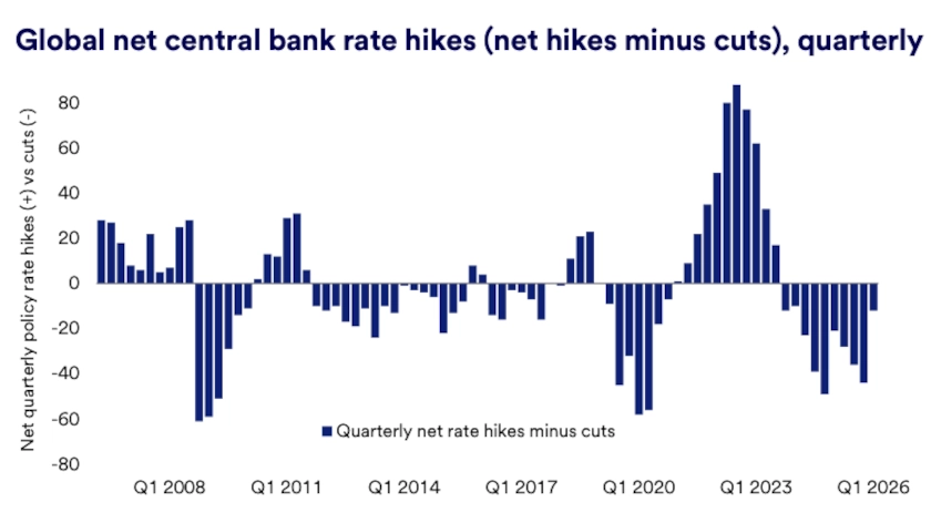 Globally, central banks eased policy in 2025. The European Central Bank, Bank of England and Bank of Canada each cut rates by 1.00%, and the Reserve Bank of Australia cut by 0.75%. Bond yields now price the possibility that foreign central banks may hike in 2026 to counter inflationary pressures from rising energy costs.