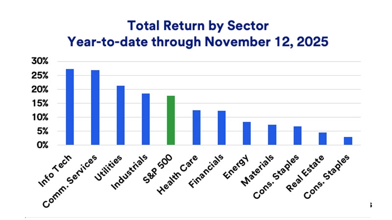 Consistent economic growth has benefited equities in 2023, 2024, and 2025, with technology stocks leading the market's rally. Significant artificial intelligence (AI)-related investment spending continues driving technology company revenues. After a slow start to the year, information technology stocks now top the S&P 500, generating year-to-date returns above 27%. Market gains have broadened in 2025, as communication services, utilities, and industrial stocks deliver returns between 18% and 27%.2
