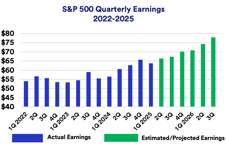 Analysts currently forecast roughly 8.5% S&P 500 earnings growth in 2025 compared to the previous year. 1 Analyst forecasts are subject to change as new information emerges. So far in 2025, analysts’ earnings growth expectations ranged from 10% earlier in the year, to -6% after President Donald Trump’s initial tariff announcement. Even in the new tariff environment, the economy and corporate profits remain solid. Importantly, newly enacted tax legislation (the so-called One Big Beautiful Bill Act) allows companies to fully expense or depreciate certain costs, thereby lowering taxes and stimulating investment activity.