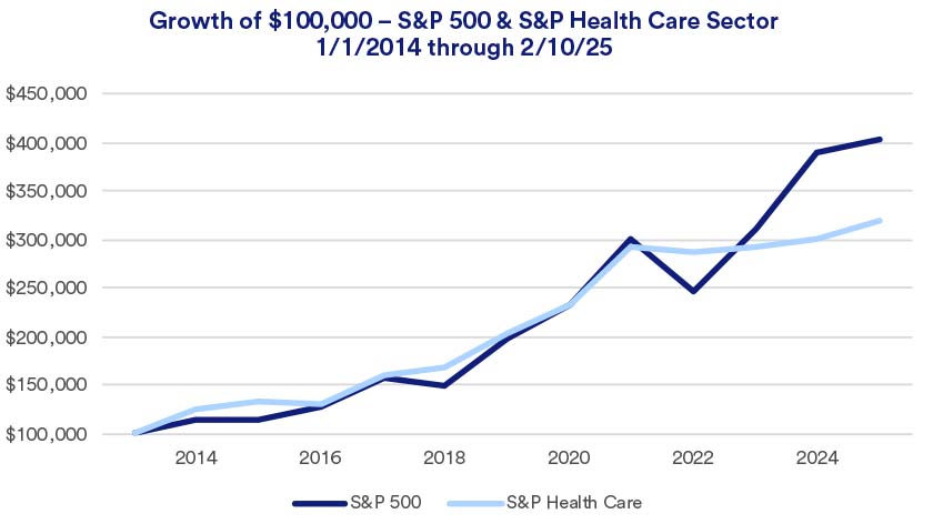 Healthcare in the U.S. represents a large and intricate ecosystem, characterized by its size, complexity, and influence on the national economy. The Healthcare sector is also one of the largest sectors in the S&P 500, representing roughly 10 percent of the market capitalization of the index, thus affording investors with ample opportunity to invest in the sector. Despite wide-ranging opportunities, the Healthcare sector generated lackluster results for investors over the past three years, posting returns of -3.6, 0.3 and 0.9 percent in 2022, 2023 and 2024 respectively. Muted returns continued in 2025, with Healthcare one of four S&P 500 sectors in negative territory, retreating 4.1 percent as of the market close on May 30. This discrepancy, between the compelling underlying backdrop and subpar returns, leaves many investors wondering how to best invest in and around the Healthcare sector. This commentary highlights some of the opportunities and challenges impacting performance of the Healthcare sector, diseases driving spending across the Healthcare sector, and areas of investment appeal, including Artificial Intelligence (AI) in Healthcare.