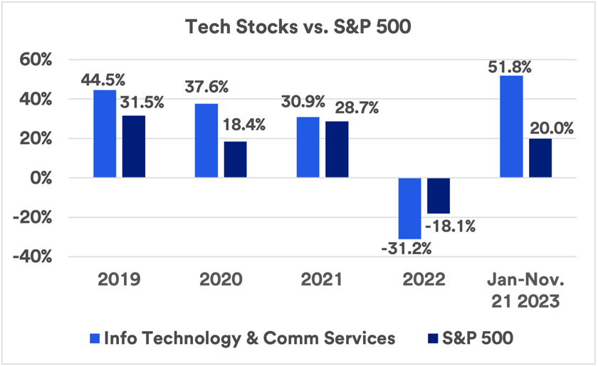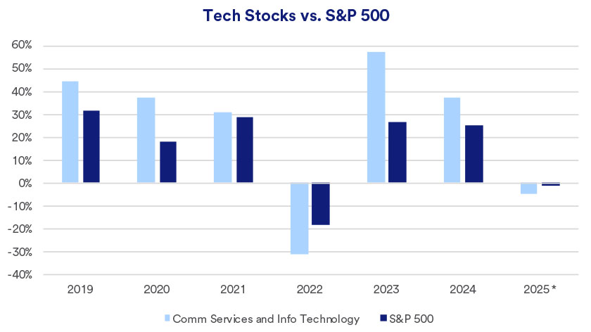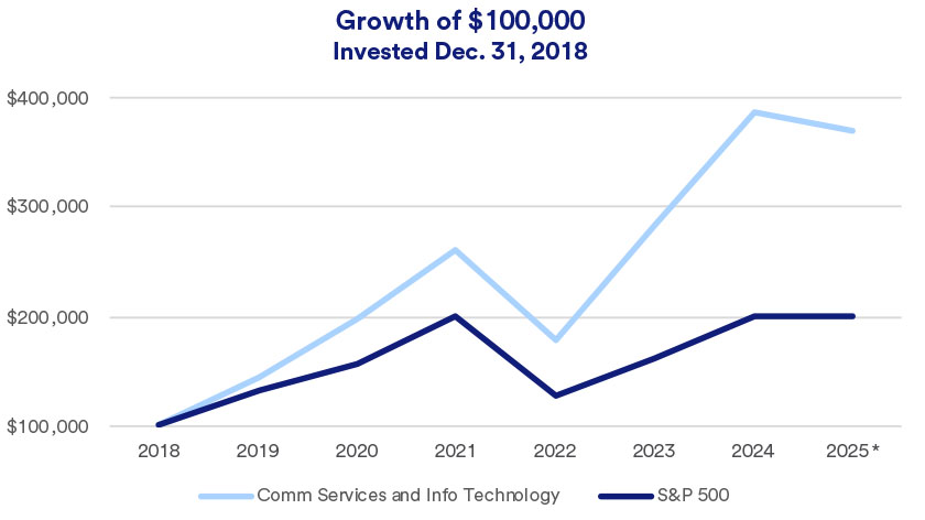 Tech stocks posted an impressive track record in recent years. A hypothetical $100,000 investment in the S&P 500 communications services and information technology index in 2018 would have grown to over $480,000 by 2025, far surpassing the S&P 500’s overall return.3