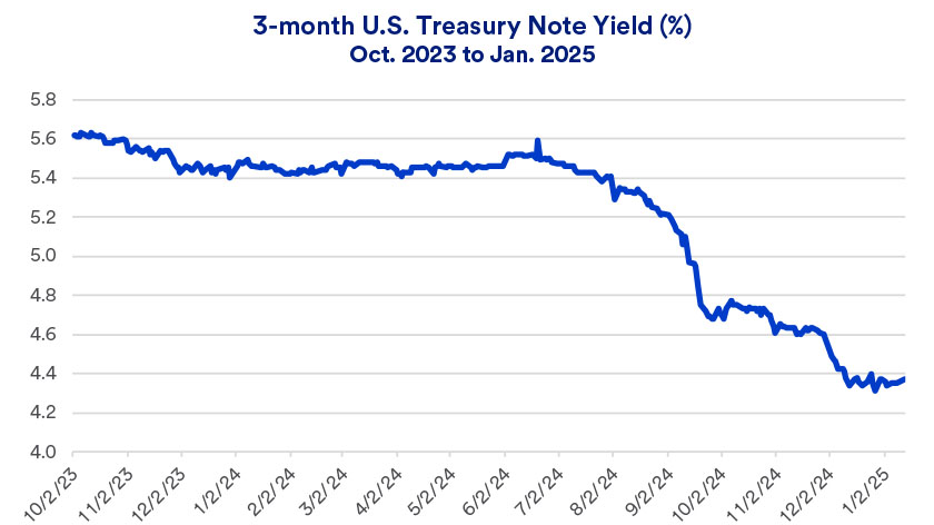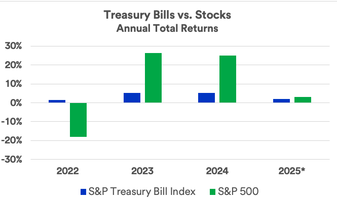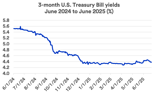 For years, money market accounts, CDs, and U.S. Treasury bills provided only modest returns. Recently, investors enjoyed elevated yields as interest rates rose, with 3-month U.S. Treasury bills yields exceeding 5%. 2 The Federal Reserve (Fed)’s aggressive rate hikes in 2022 and 2023 drove this yield surge, but since late 2024, subsequent rate cuts have caused short-term yields to fall from their peaks. Despite declining short-term rates, cash yields remain attractive to investors, prompting investors to question whether they are holding too much money in cash-equivalent vehicles.