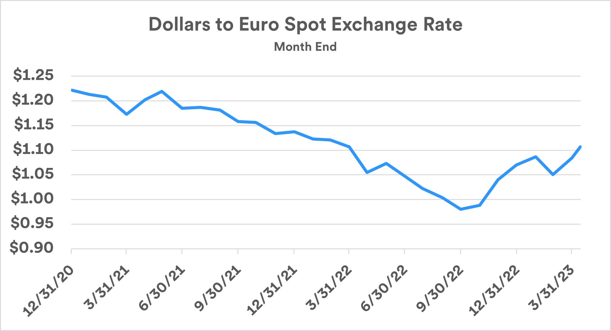 A stronger dollar lowers the cost of U.S. imports. For example, a German car that retails for €50,000 would cost $60,000 in the U.S. at an exchange rate of $1.20 to €1. If the dollar strengthens to $0.90 to €1, the car’s U.S. price drops to $45,000, saving U.S. consumers money.
