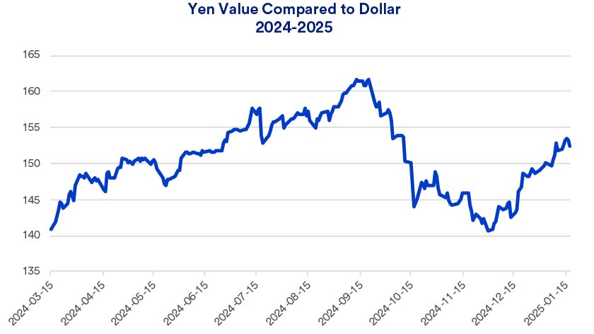 Two main factors caused the dollar’s decline in early 2025: President Trump announced tariffs, raising inflation expectations, and investors anticipated more Federal Reserve rate cuts. Rising inflation and lower rate expectations weakened the dollar. In the second half, stable inflation and Fed rate cut expectations kept the dollar relatively rangebound. “Changes to rate cut expectations could impact the value of the dollar, since the European Central Bank, Bank of England, Bank of Canada, and others already cut rates ahead of the Fed. The anticipation the Fed will follow in coming quarters has kept the dollar from appreciating much so far in the second half,” notes Bill Merz, head of capital markets research for U.S. Bank Asset Management Group.