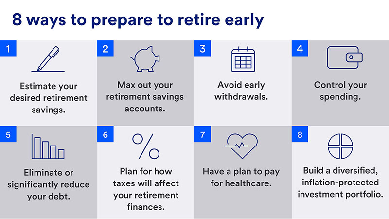 Preparing for early retirement can include maxing out your retirement savings and planning both expected expenses, like healthcare, and unexpected expenses.