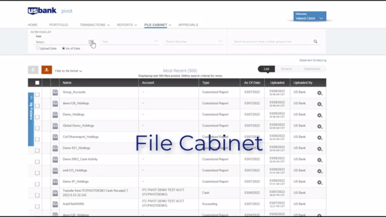 Search, filter and download documents Schedule statements for delivery to the File Cabinet and locate tax documents.