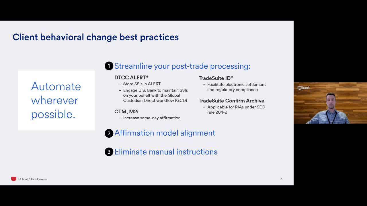 Please coordinate through your relationship manager, custody administrator or trade services analyst. Also, please note that someone from the above team(s) will be reaching out to you proactively if we identify through our data analysis that your activity could be improved ahead of T+1. Examples of potential changes include optimizing the affirmation process or your current model, how you currently instruct U.S. Bank for trade instructions, and the use of industry utilities such as DTCC ALERT® global custodian direct (GCD) for SSI management.