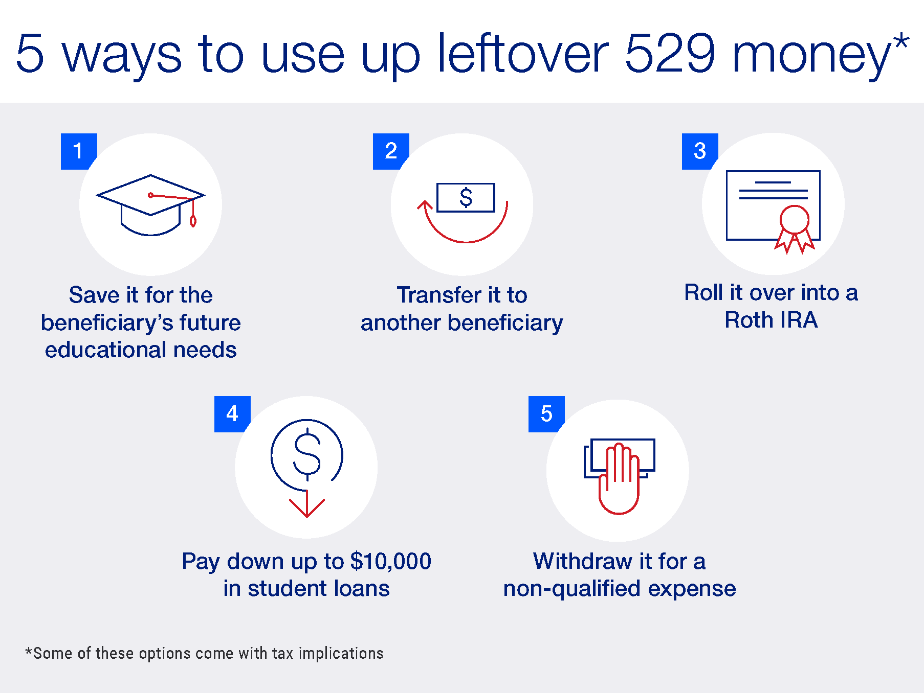 There are several ways to use up leftover 529 funds, including transferring them to another beneficiary or rolling them over into a Roth IRA.