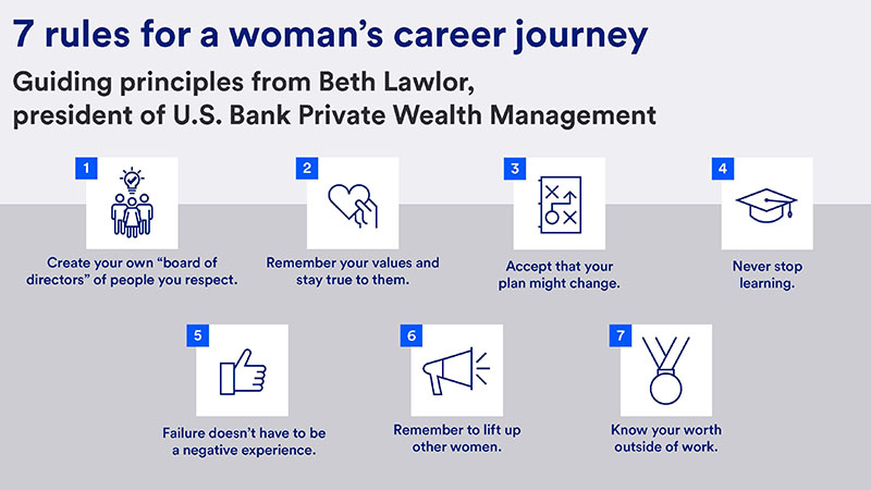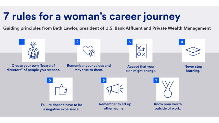 As a result, Lawlor believes that women’s careers tend to be crooked lines, more “lattice” than linear, so finding a way to blend life with work (rather than balancing it evenly) is critical. Following are her seven principles for women to consider when thinking about career growth.